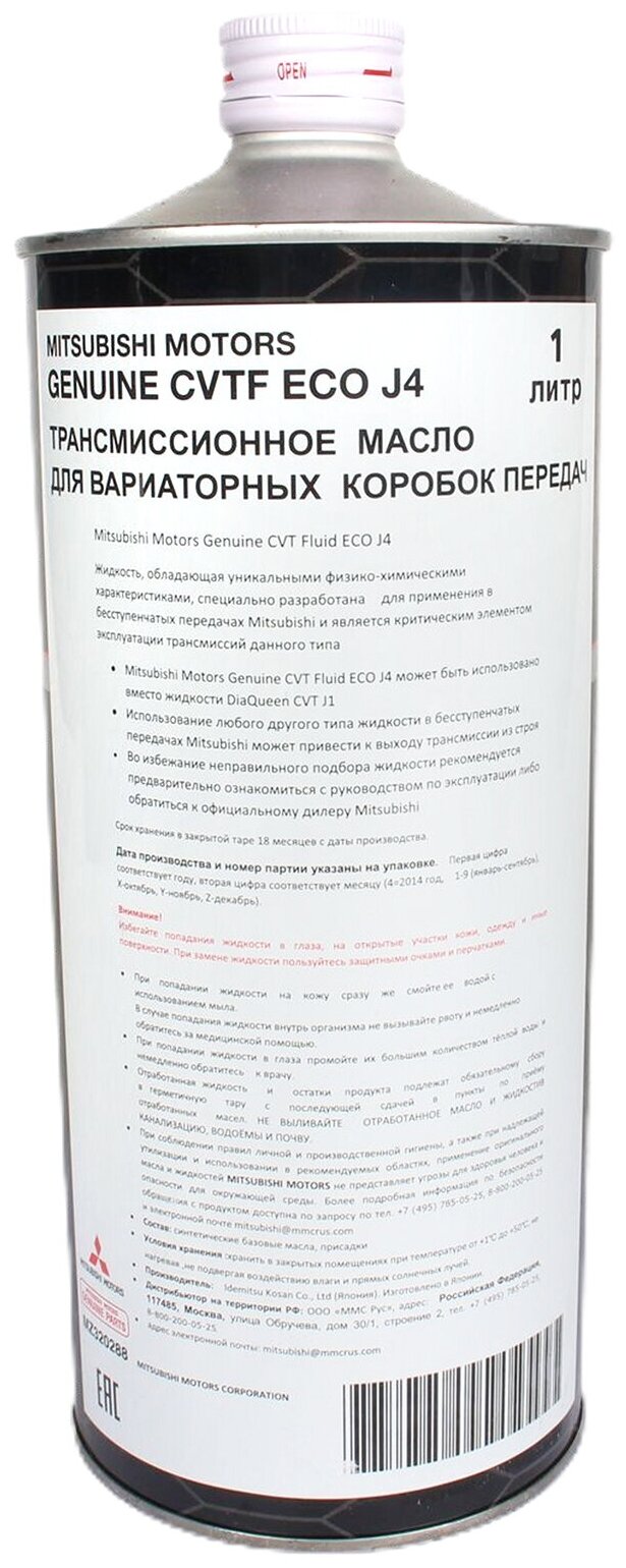 Mitsubishi Cvtf Eco J4 Масло Трансмиссионное Для Вариаторов (Железо/Япония) (1l) MITSUBISHI арт. MZ320288