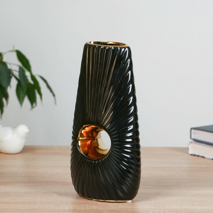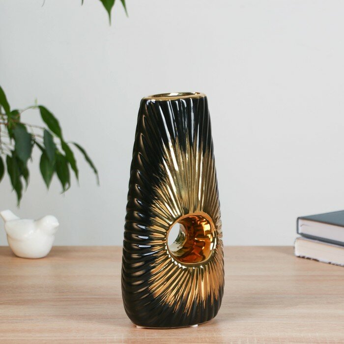 Керамическая ваза декоративная настольная «Дерк» полосы, для цветов, сухоцветов, d-9.5 см, h-24.5 см, золотисто-чёрный