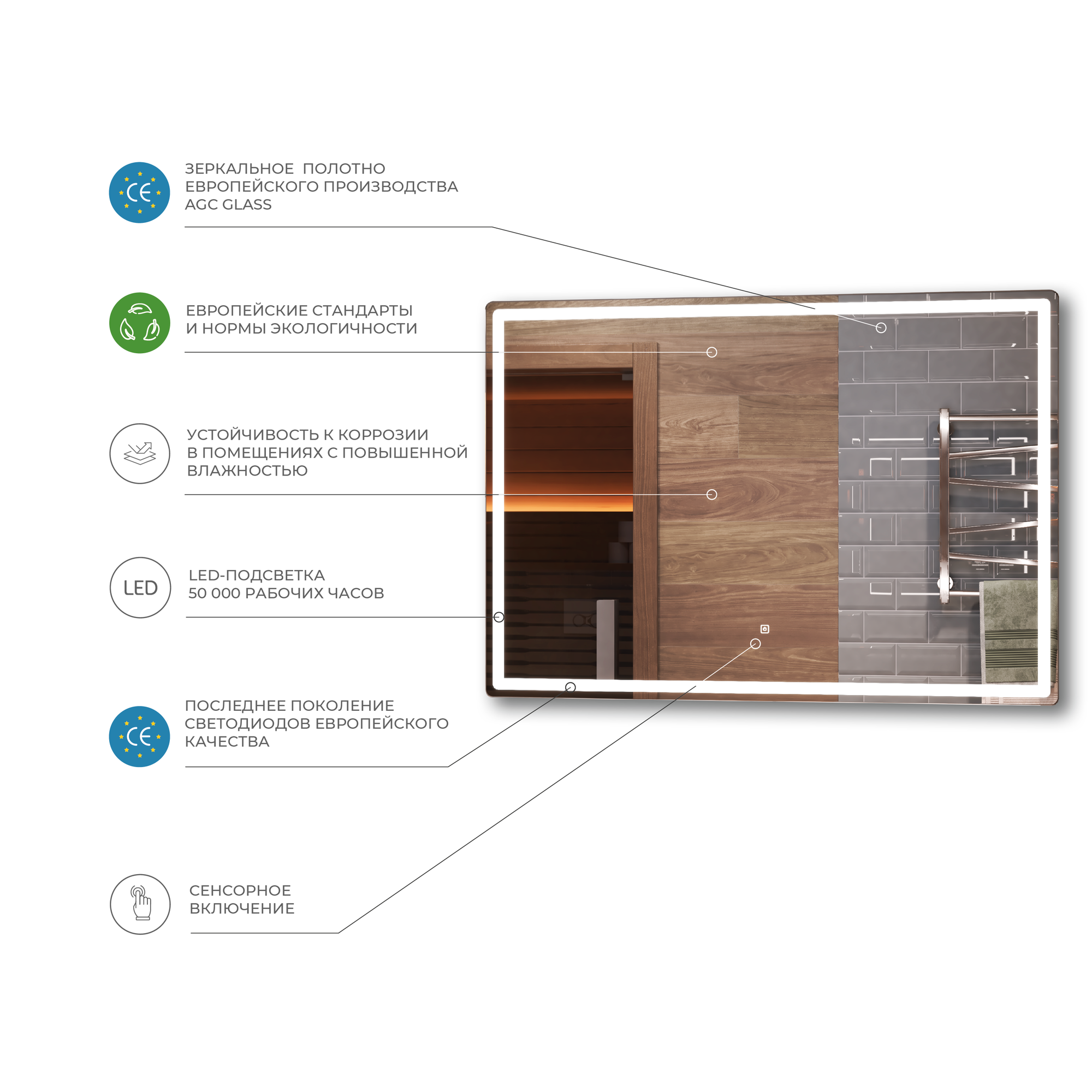 Зеркало настенное для ванной КерамаМане 70*100 см с холодной подсветкой 6000 К с сенсорной кнопкой