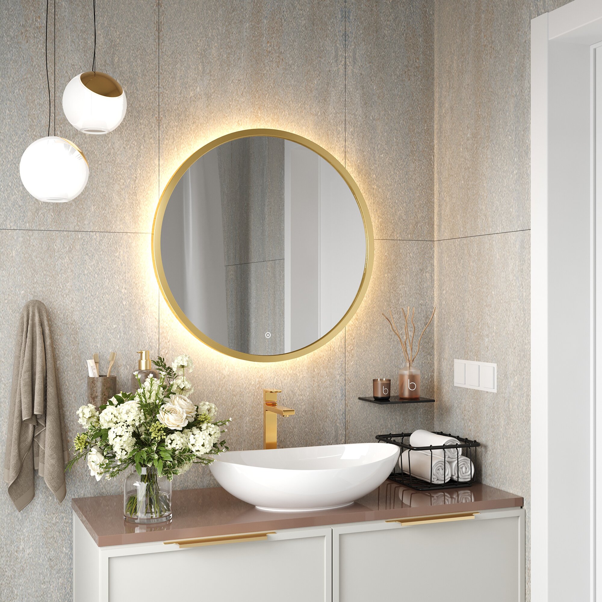 Зеркало в золотой раме D80 для ванной с тёплой подсветкой, сенсор с диммером, класс защиты IP44 Max Mirrors