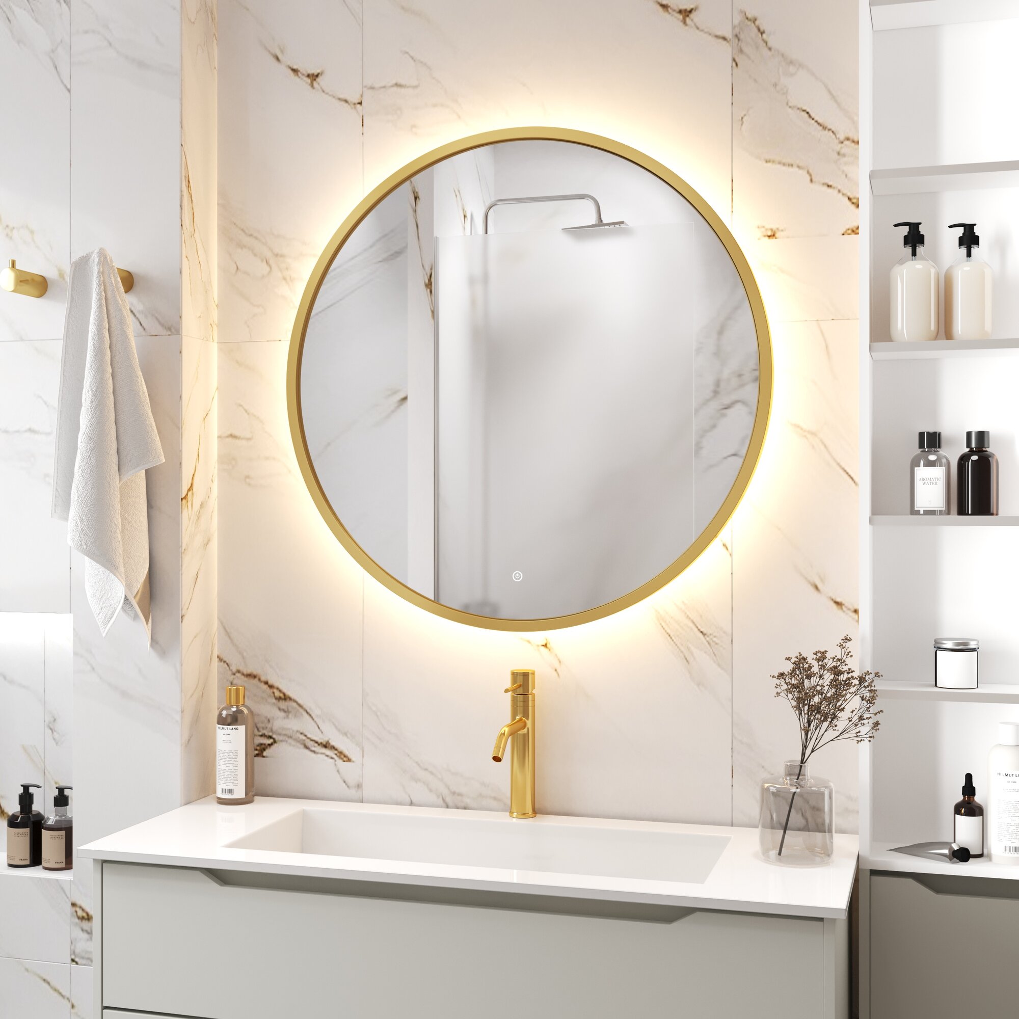 Купить Зеркало в золотой раме D70 для ванной с тёплой подсветкой, сенсор с диммером, класс защиты IP44 Max Mirrors