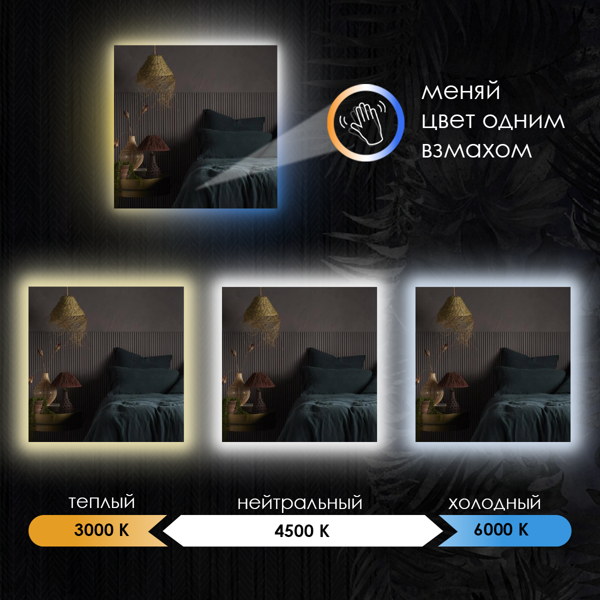 Зеркало для ванной квадратное, контурная подсветка, подогрев, управление взмахом руки, 60х60 см.