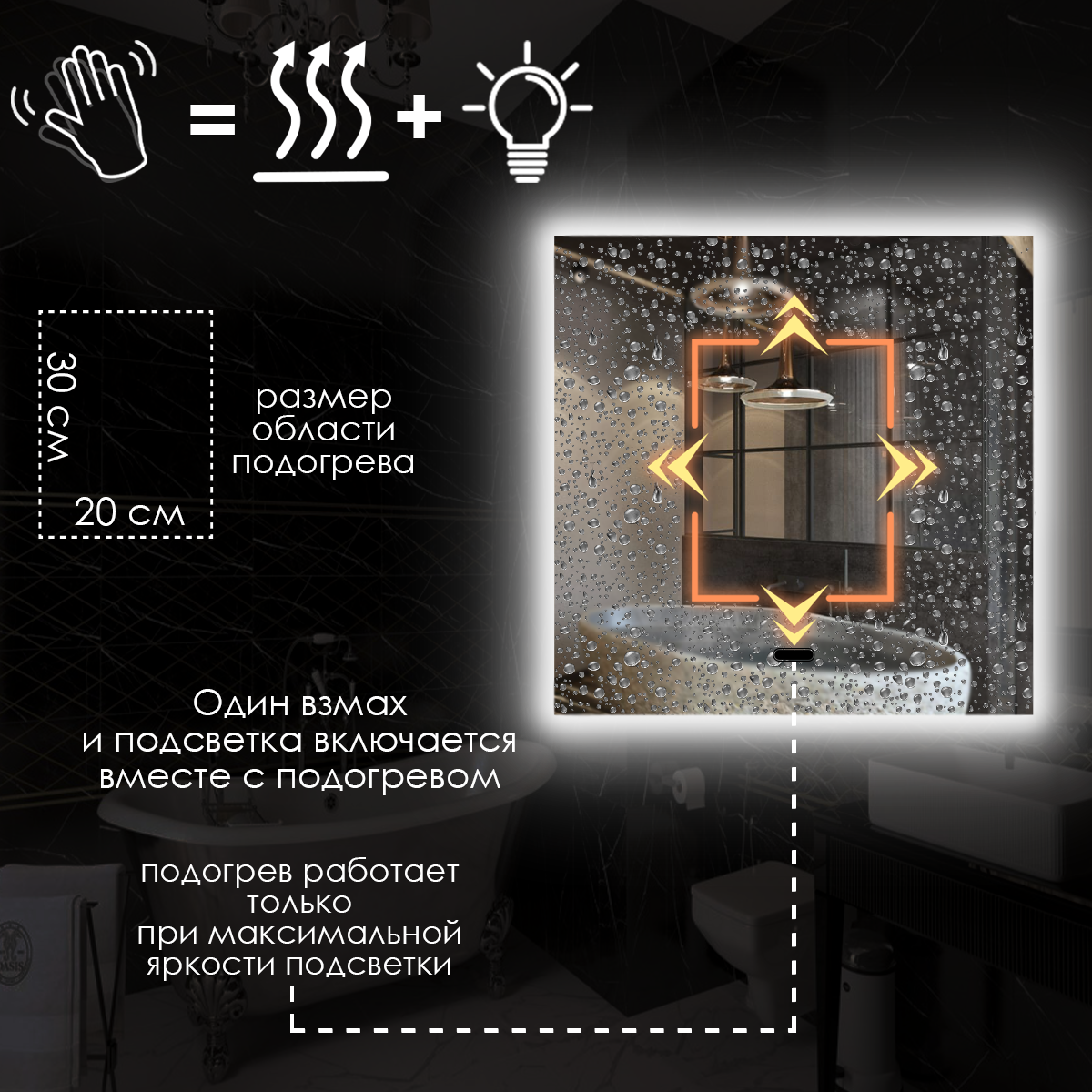 Зеркало для ванной квадратное, контурная подсветка, подогрев, управление взмахом руки, 65х65 см.