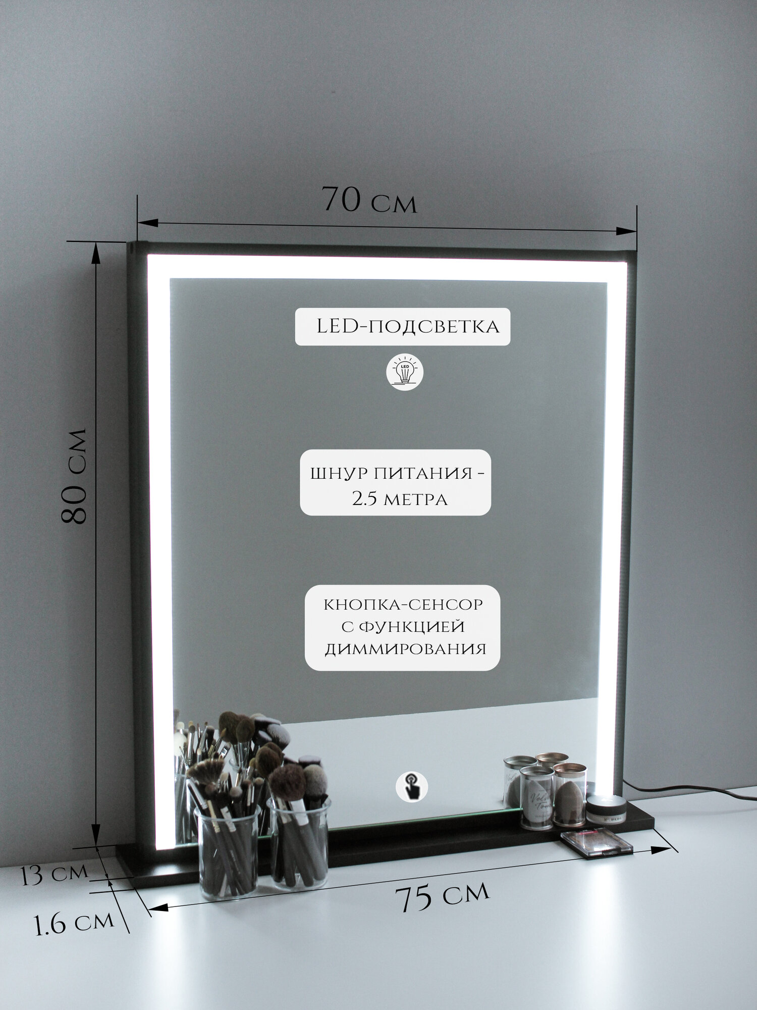 Гримерное зеркало с LED подсветкой, на подставке черное 70*80см интересное: