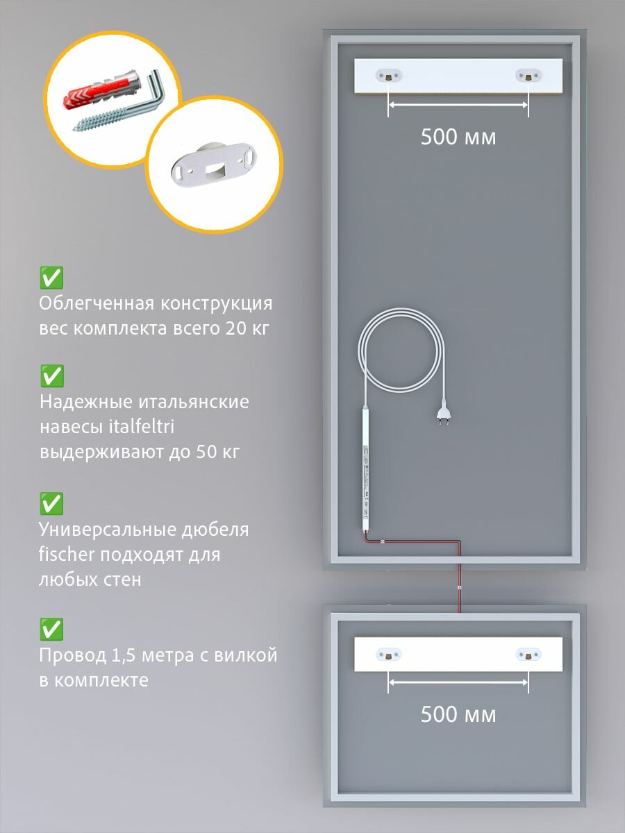 Зеркало настенное для ванной КерамаМане 70*100 см с холодной подсветкой 6000 К с сенсорной кнопкой