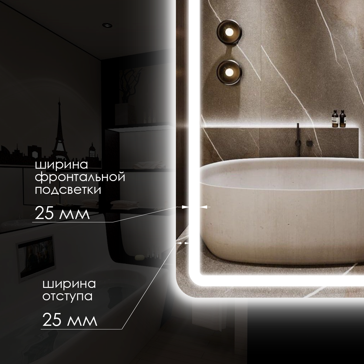 Зеркало интерьерное настенное с подсветкой парящее полукруглое левое для ванной