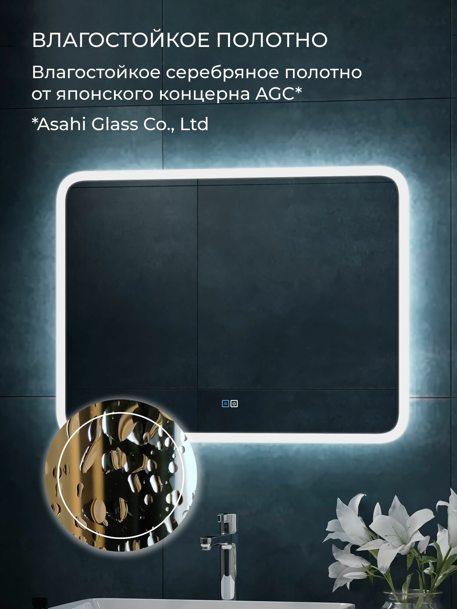 Зеркало с ореольной LED подсветкой в ванную комнату 100*80 см (холодный свет 6000К, прямоугольное настенное для ванной сенсорное выключение)