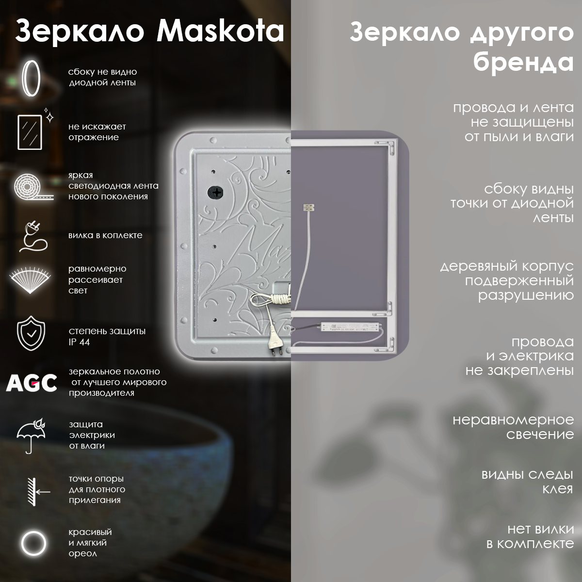 Зеркало настенное Maskota для ванной квадратное скругленное, с парящей подсветкой на стену 6000К, 60х60 см