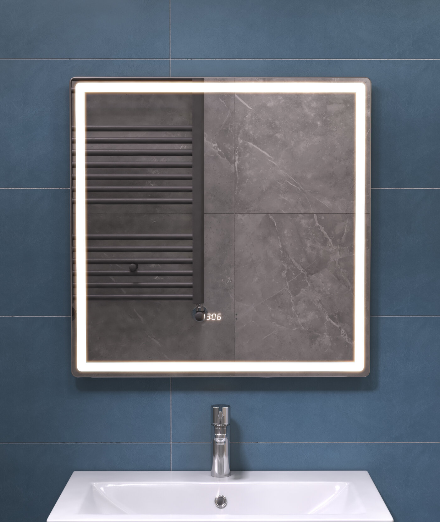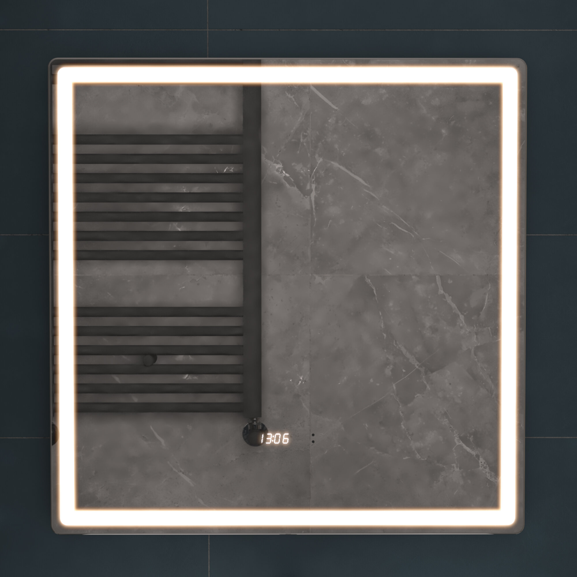 Купить Зеркало с подсветкой в ванную 70х70 см Geometry Luxe с бесконтактным включением на взмах подогревом и часами 5000К
