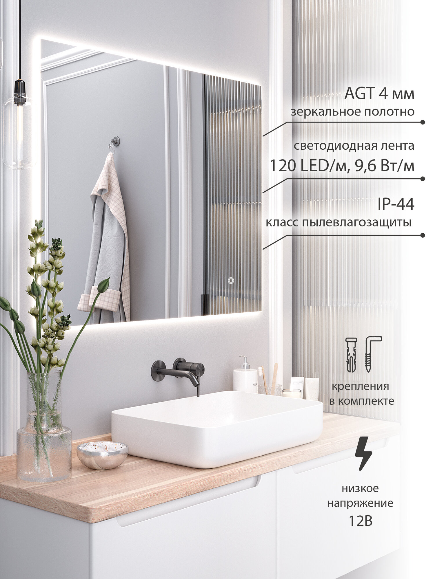 Зеркало настенное с подсветкой SIRIUS 50*70см, 70х50 универсальное , сенсорный выключатель / AQUA DE MARCO