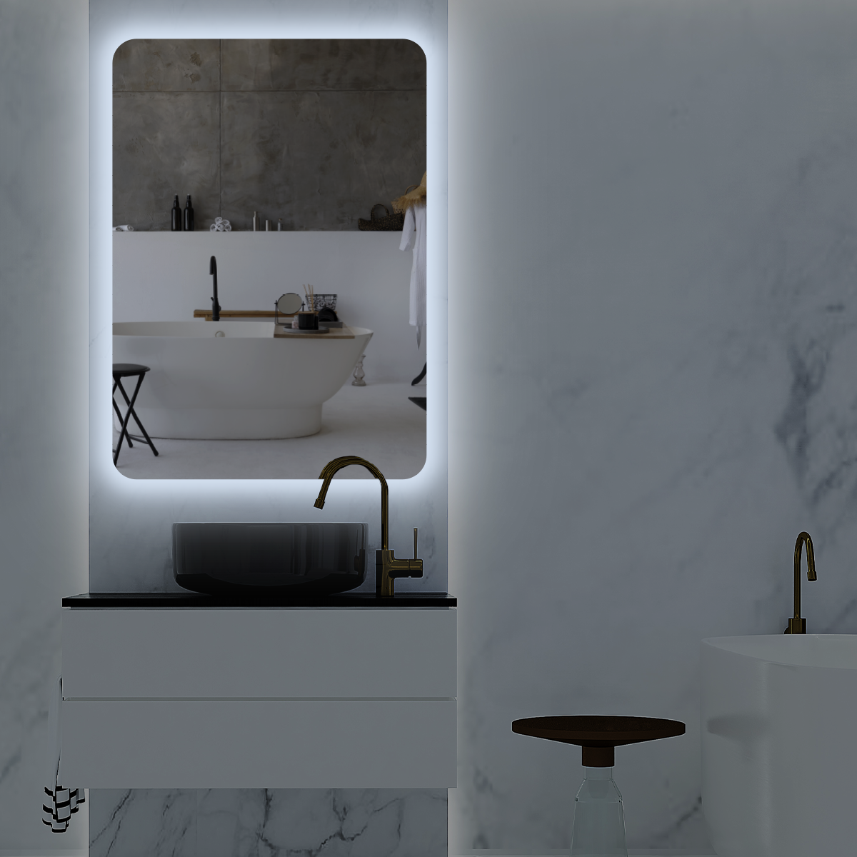 СохранитьЗеркало настенное Maskota для ванной прямоугольное скругленное, с парящей подсветкой на стену 6000К, часами, 80х60 см интересное: