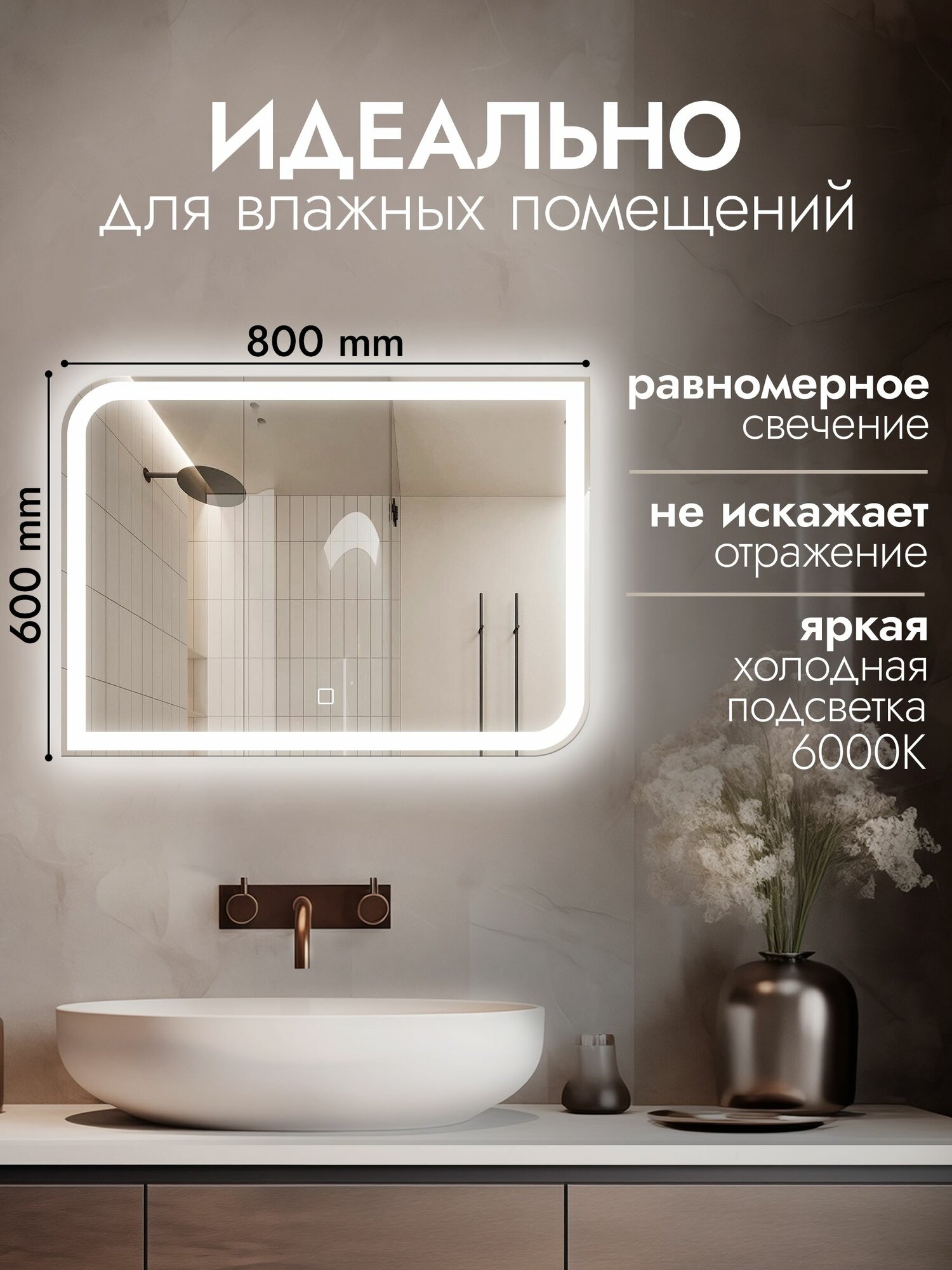 Настенное зеркало с подсветкой в ванную Montreal 60х80 см (холодный свет 6000К, сенсорное управление, прямоугольное зеркало для ванной)