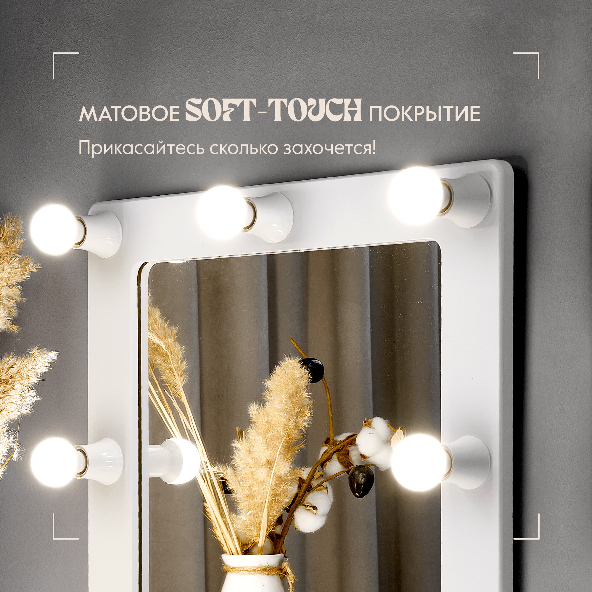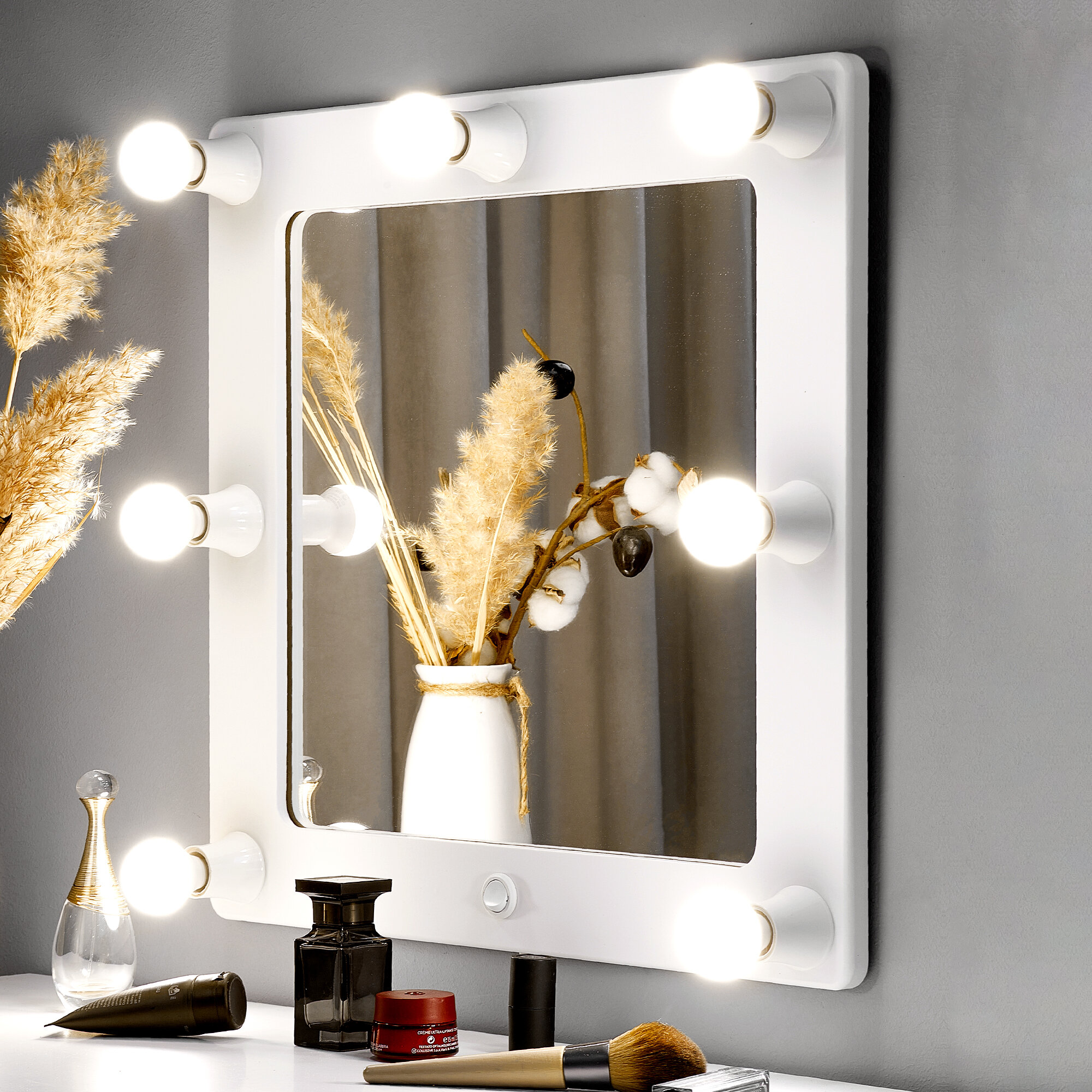 Гримерное зеркало Postermarket 129, квадратное, настенное, с подсветкой, белое дерево, 50x52 см
