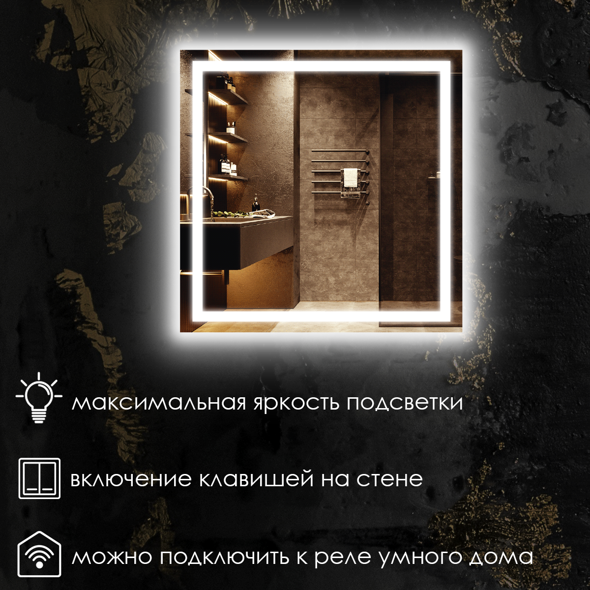Зеркало для ванной квадратное, фронтальная подсветка, нейтральный свет 4500K, подогрев, без сенсора, 75х75 см.