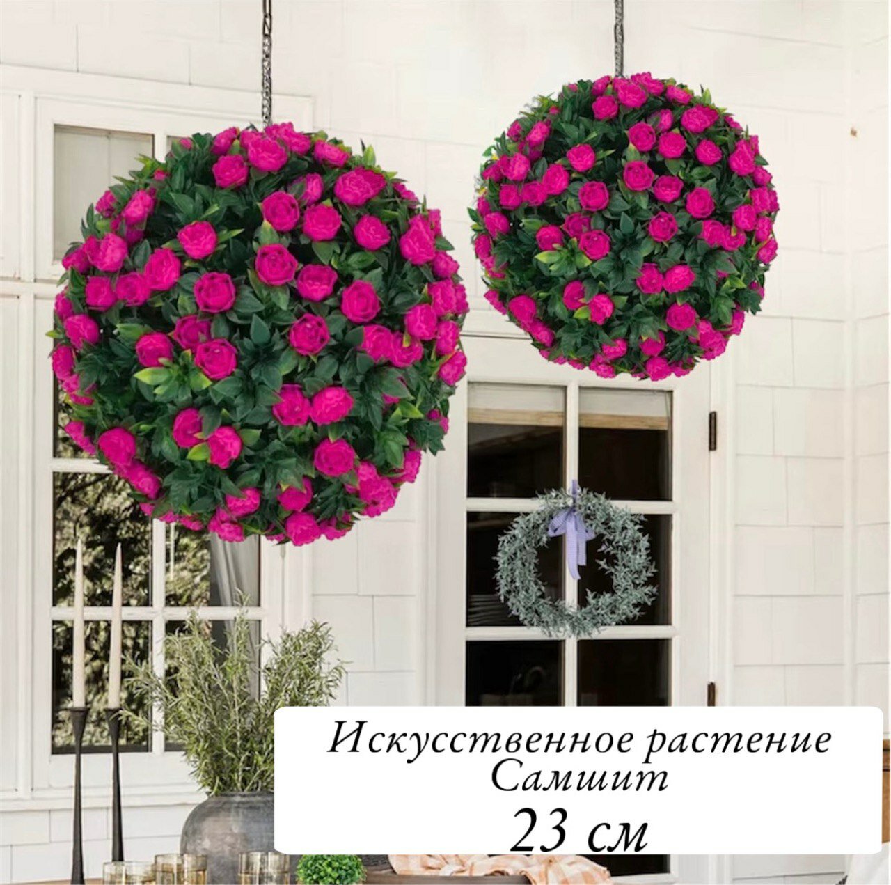 Искусственное растение "Самшит", в форме шара, с цветами фуксии, ABS пластик