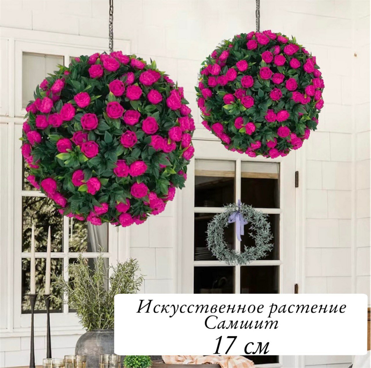 Искусственное растение "Самшит", в форме шара, с цветами фуксии, ABS пластик