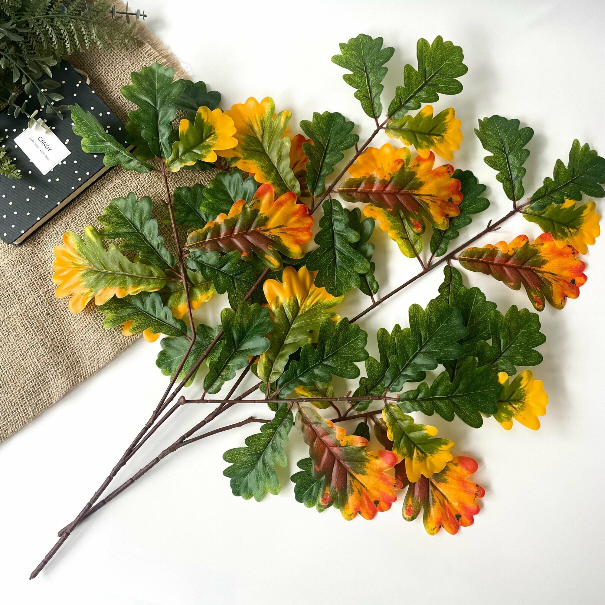 Дуб зелено-желтые листья, с желудями, искусственная зелень, ветка 60 см. Набор 2 шт