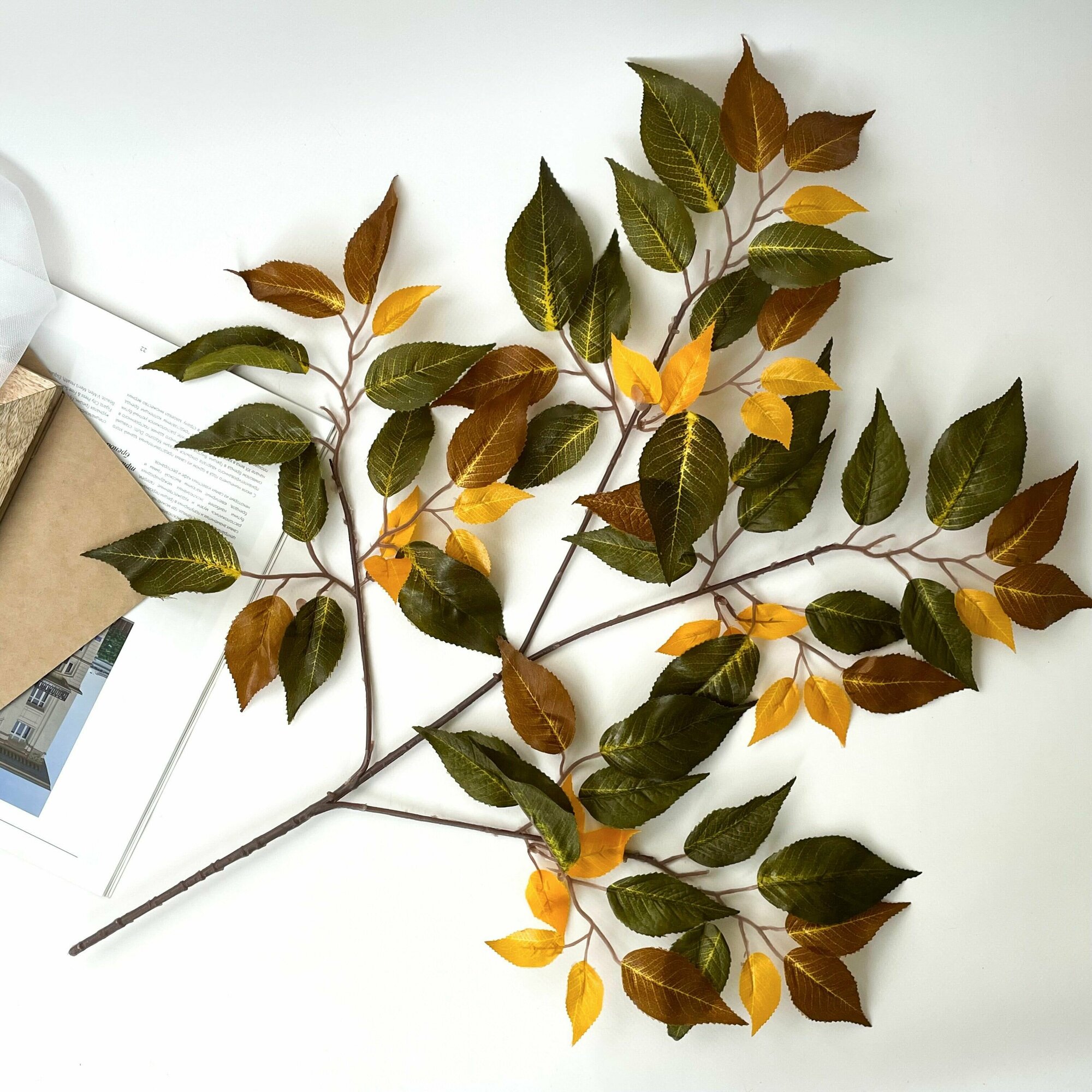 Береза искусственная, осенние листья для декора, Желто-зеленые, 68 см, 2 ветки.