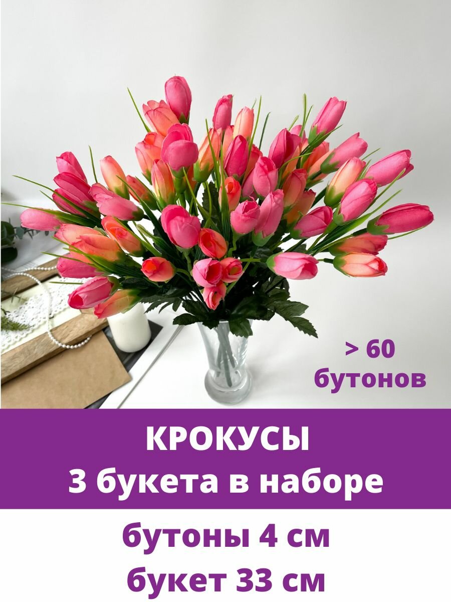 Крокусы-подснежники искусственные, Розово-малиновый микс, набор 3 букета, 33 см, больше 60 бутонов в наборе