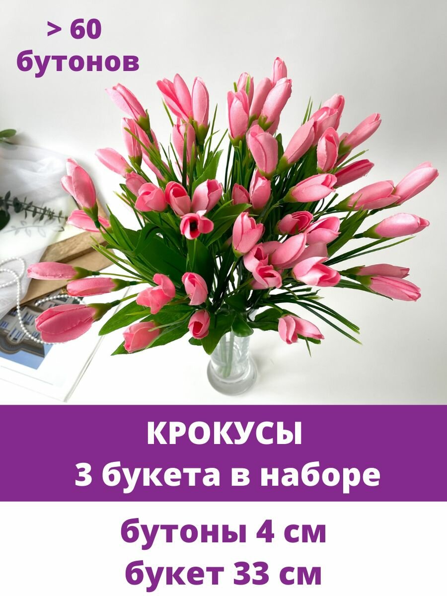 Крокусы-подснежники искусственные, Розово-малиновый микс, набор 3 букета, 33 см, больше 60 бутонов в наборе