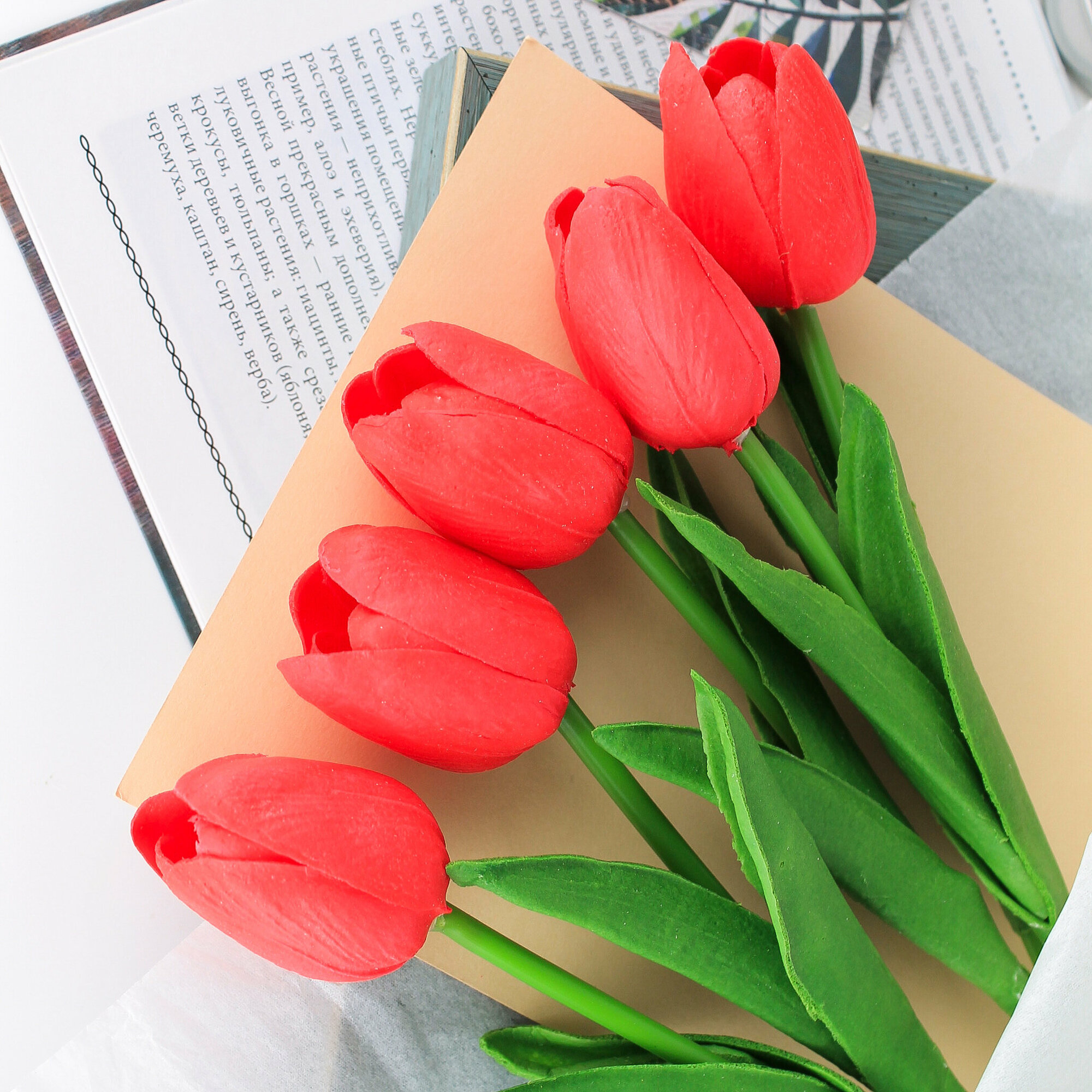Купить Тюльпаны искусственные для декора, реалистичные, красные, латексные (силиконовые), букет из 5 штук, 34 см
