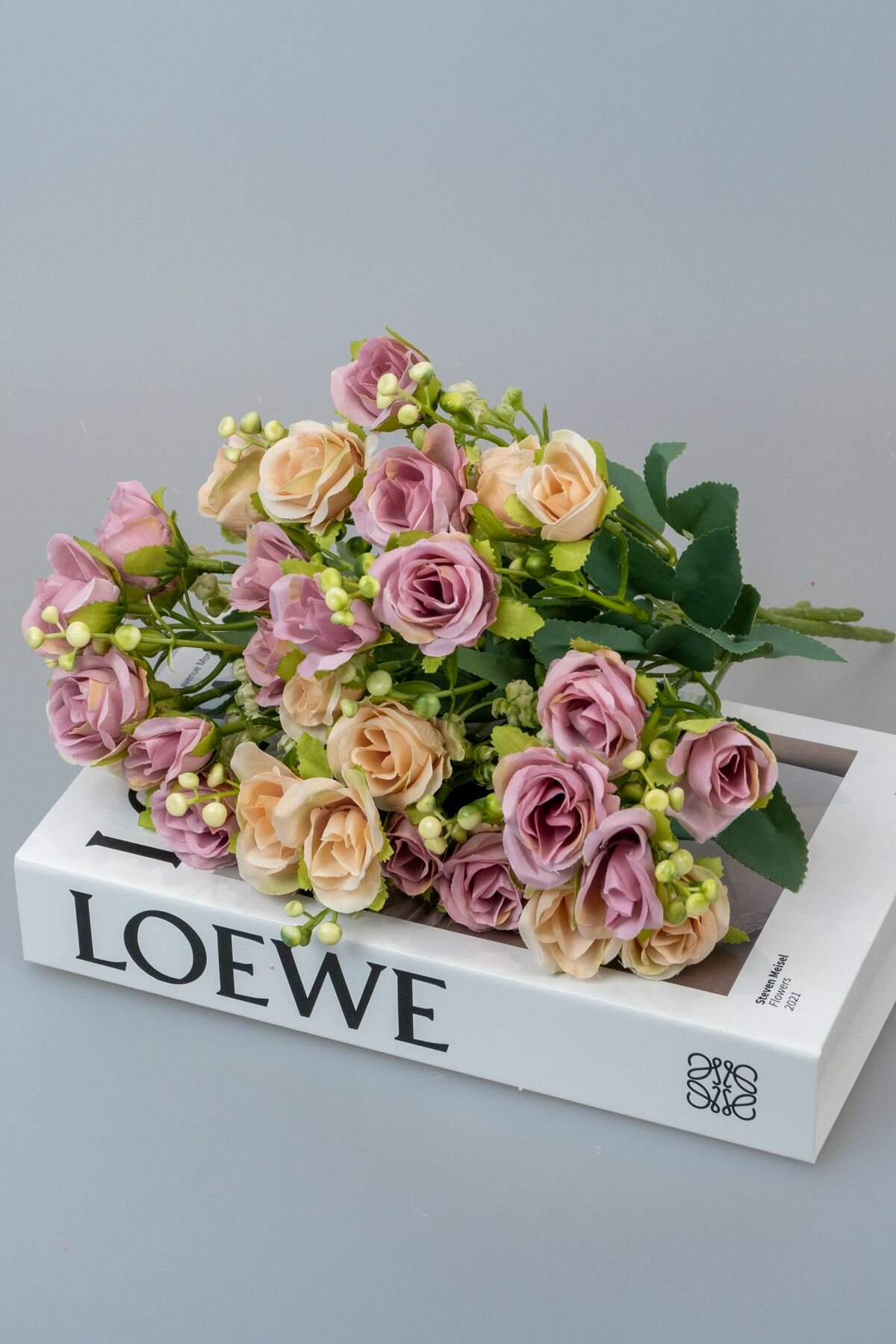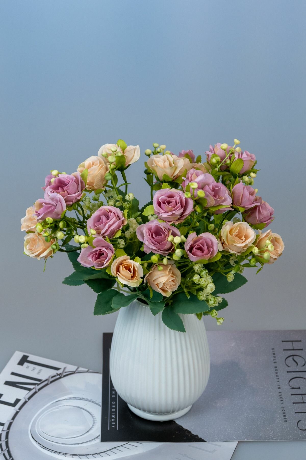 СохранитьБукет искусственных цветов для интерьера декора и кашпо мини розы с зеленью 3 ветки сиреневые интересное: