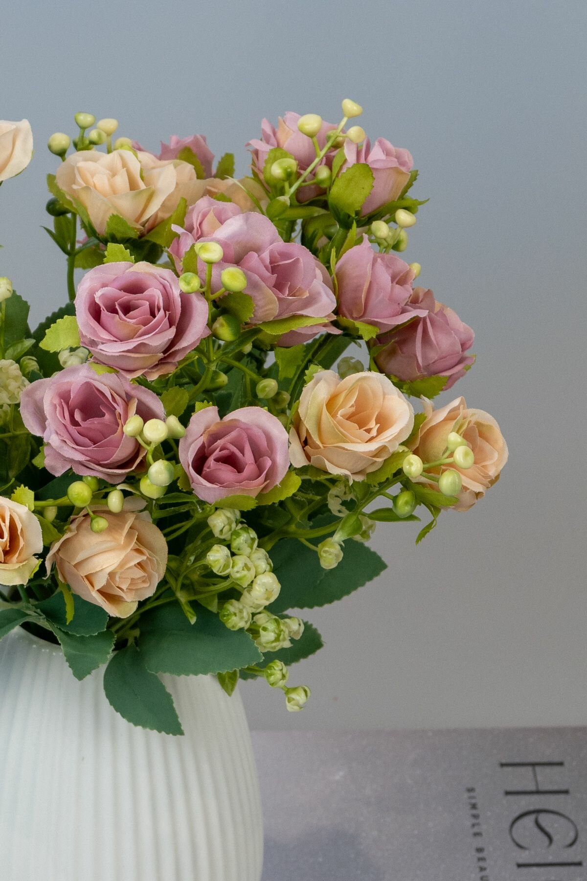 Букет искусственных цветов для интерьера декора и кашпо мини розы с зеленью 3 ветки пудровый