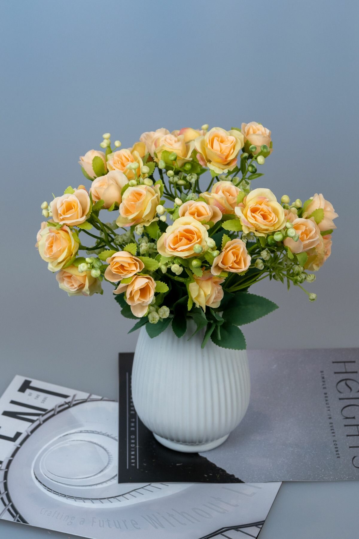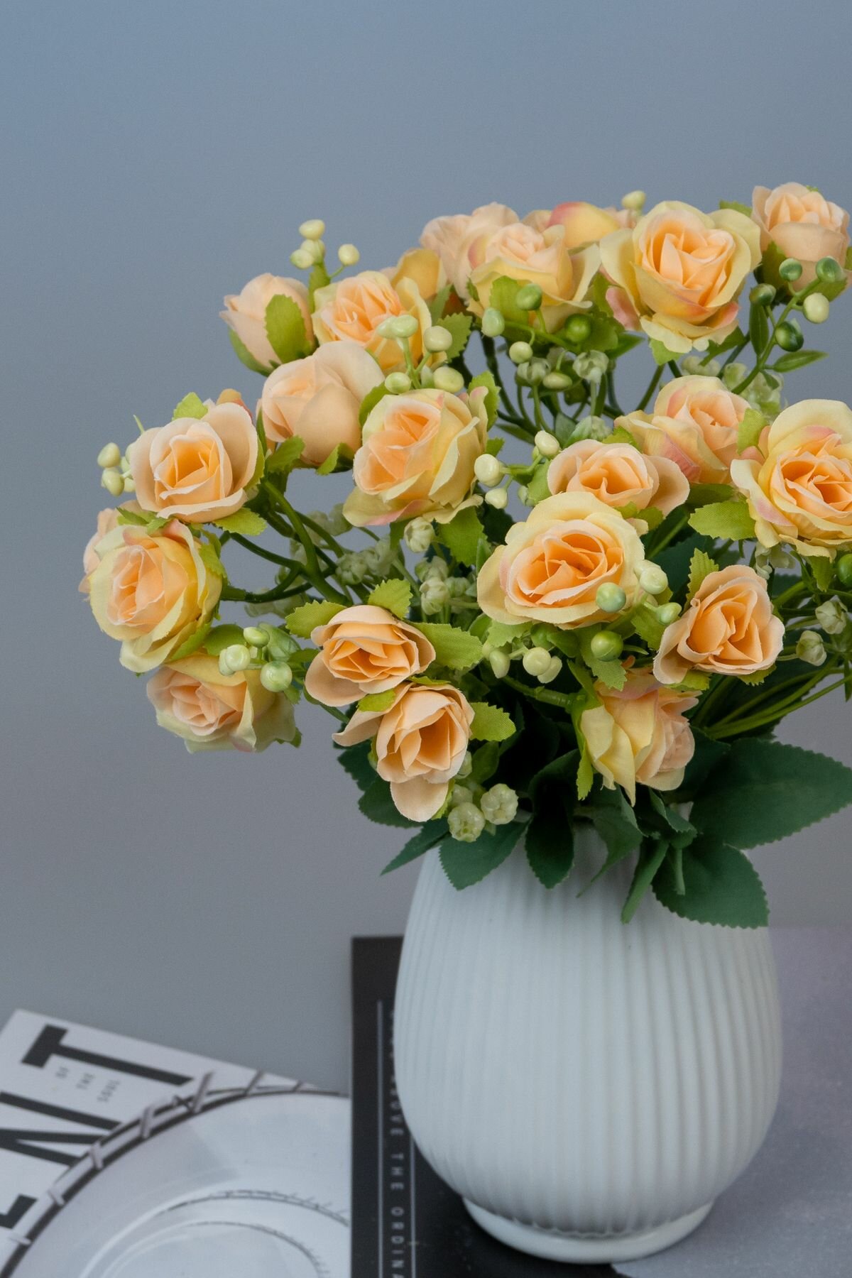 Купить Букет искусственных цветов для интерьера декора и кашпо мини розы с зеленью 3 ветки абрикосовый