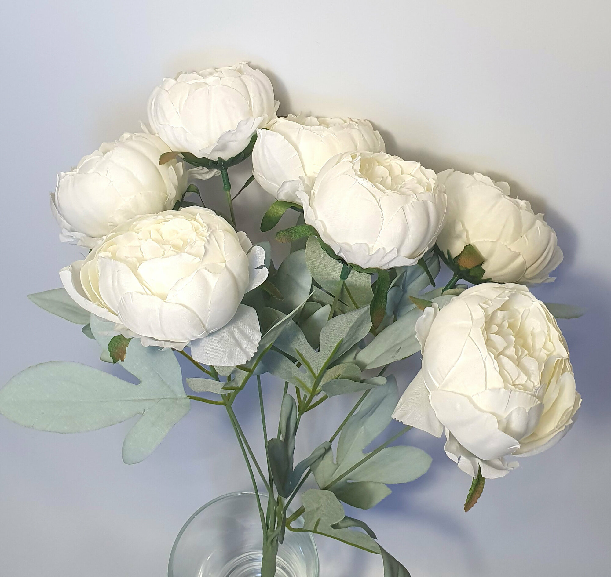 Купить Пионы крупные белые с пепельно зеленой листвой, искусственные цветы, букет 40 см, 7 голов по 8 см .