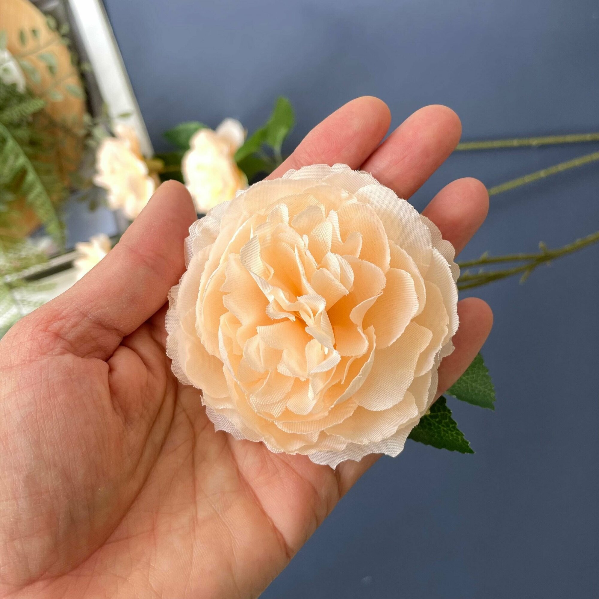 Пионы крупные кремовые с пепельно зеленой листвой, искусственные цветы, букет 40 см, 7 голов по 8 см .