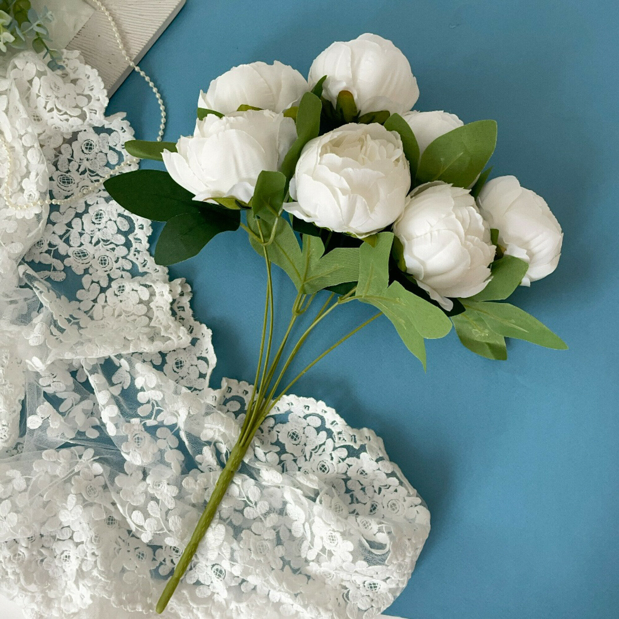 Пионы Белые искусственные евро, букет 32 см, 8 голов, набор 2 шт.