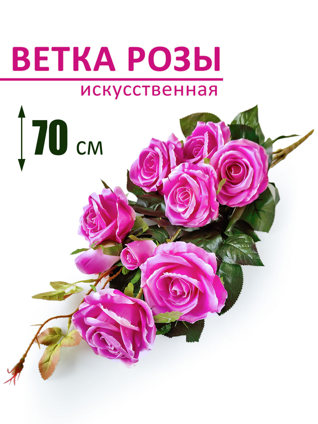 Ветка розы искусственная большая для декора, 70 см. Цвет: Ярко-розовый