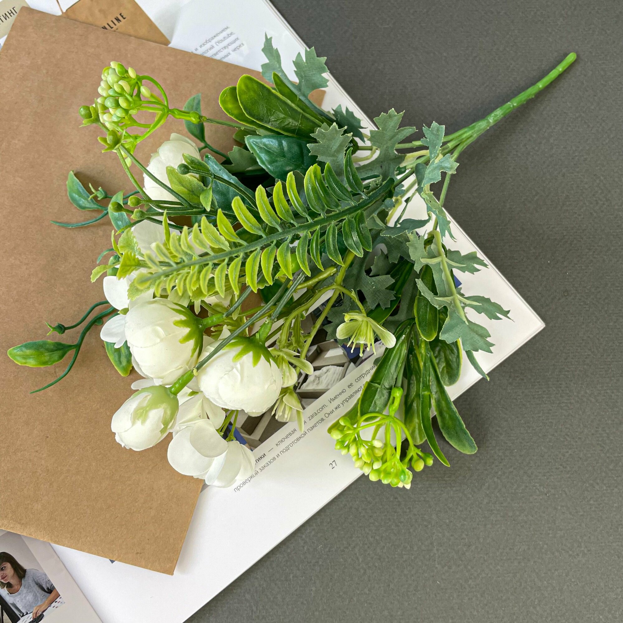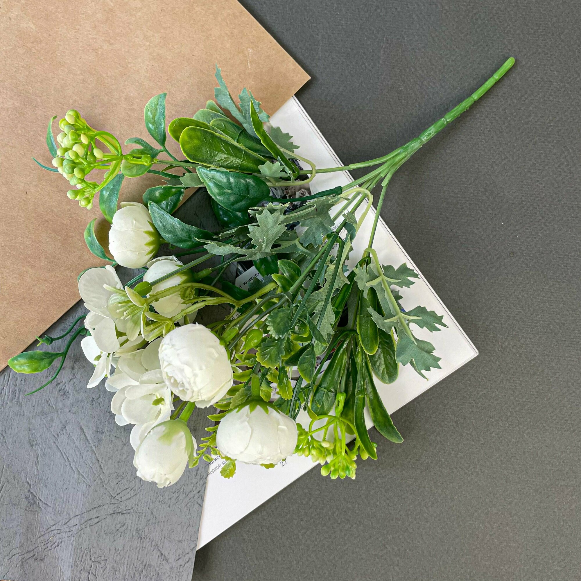 Камелии искусственные с гортензией и травяной добавкой, Белые, букет 5 веток, 26 см. интересное: