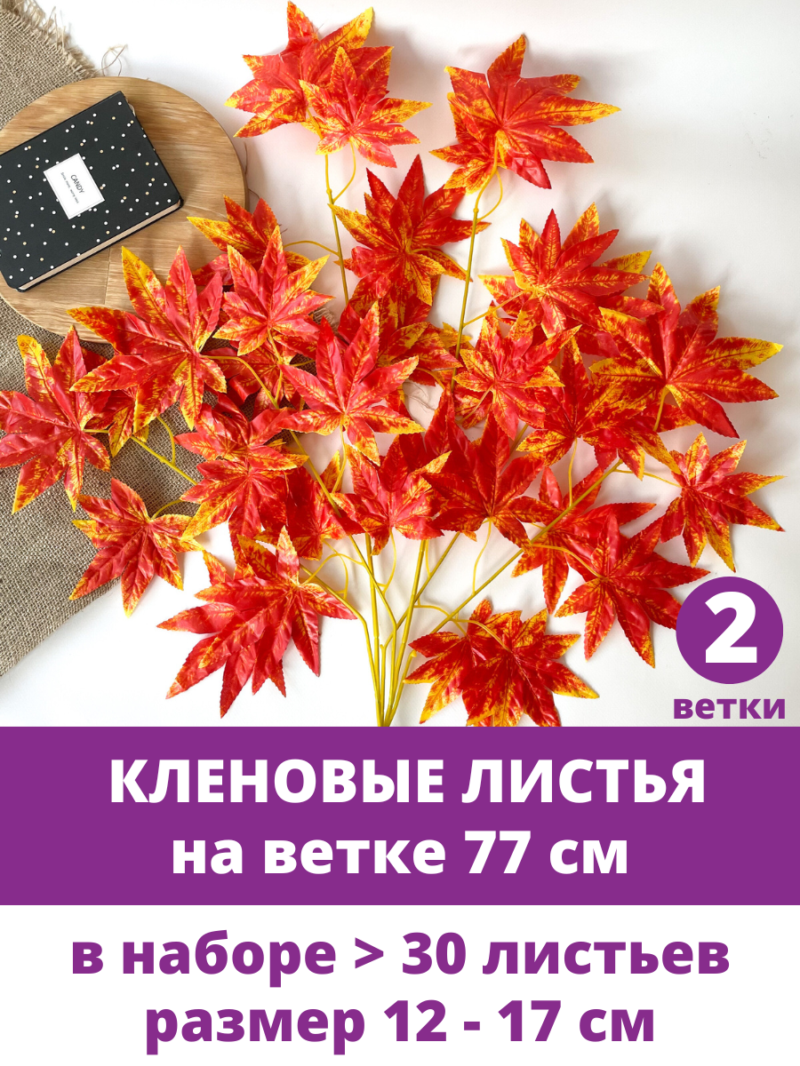 Кленовые листья искусственные, на ветке для декора, 75 см, осенние листья 10 - 17 см, 2 ветки.