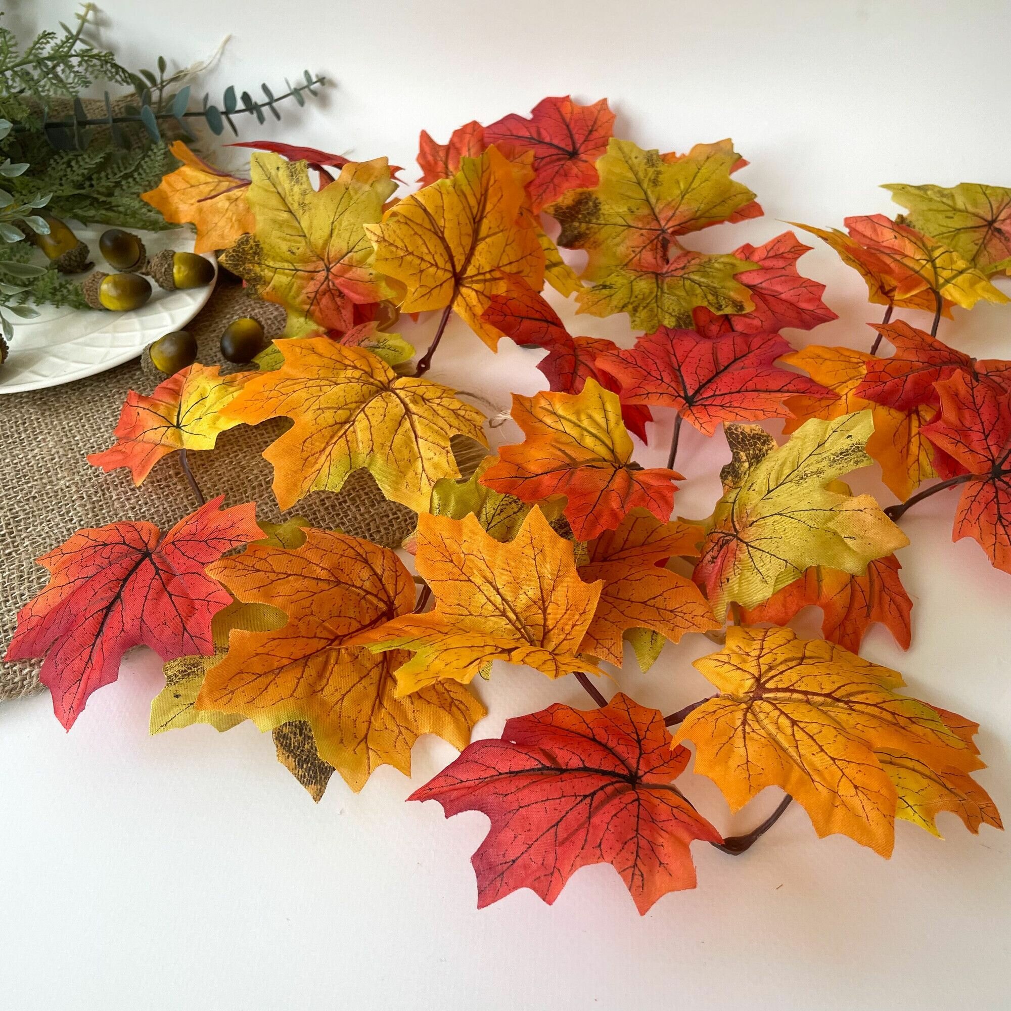 Кленовые листья искусственные на ветке, на проволоке, 34 см, осенние листья 3,5 - 7 см, 10 веток