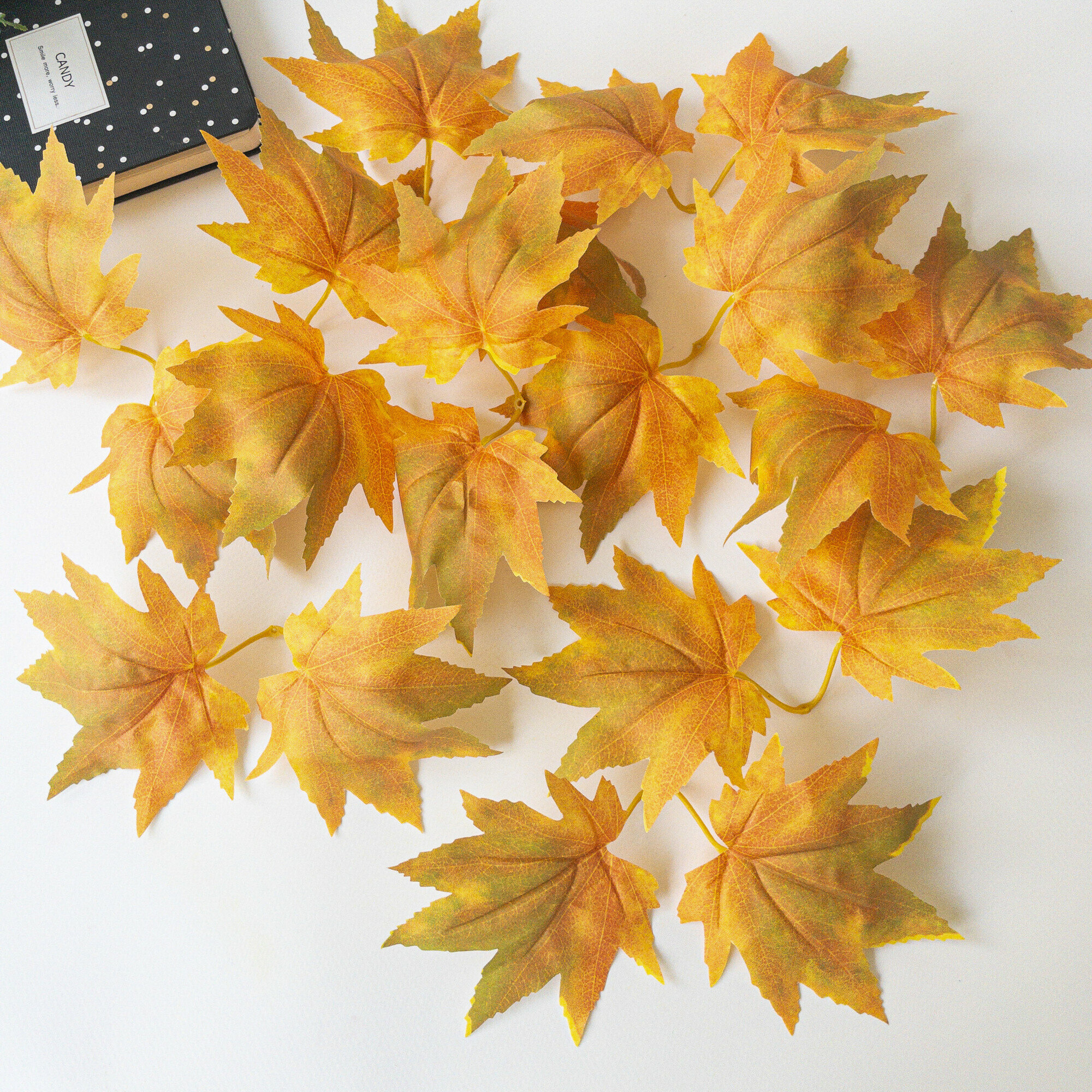 Кленовые листья, осенние, искусственные, Оранжевые, лиана 2,35 метра, 3 штуки