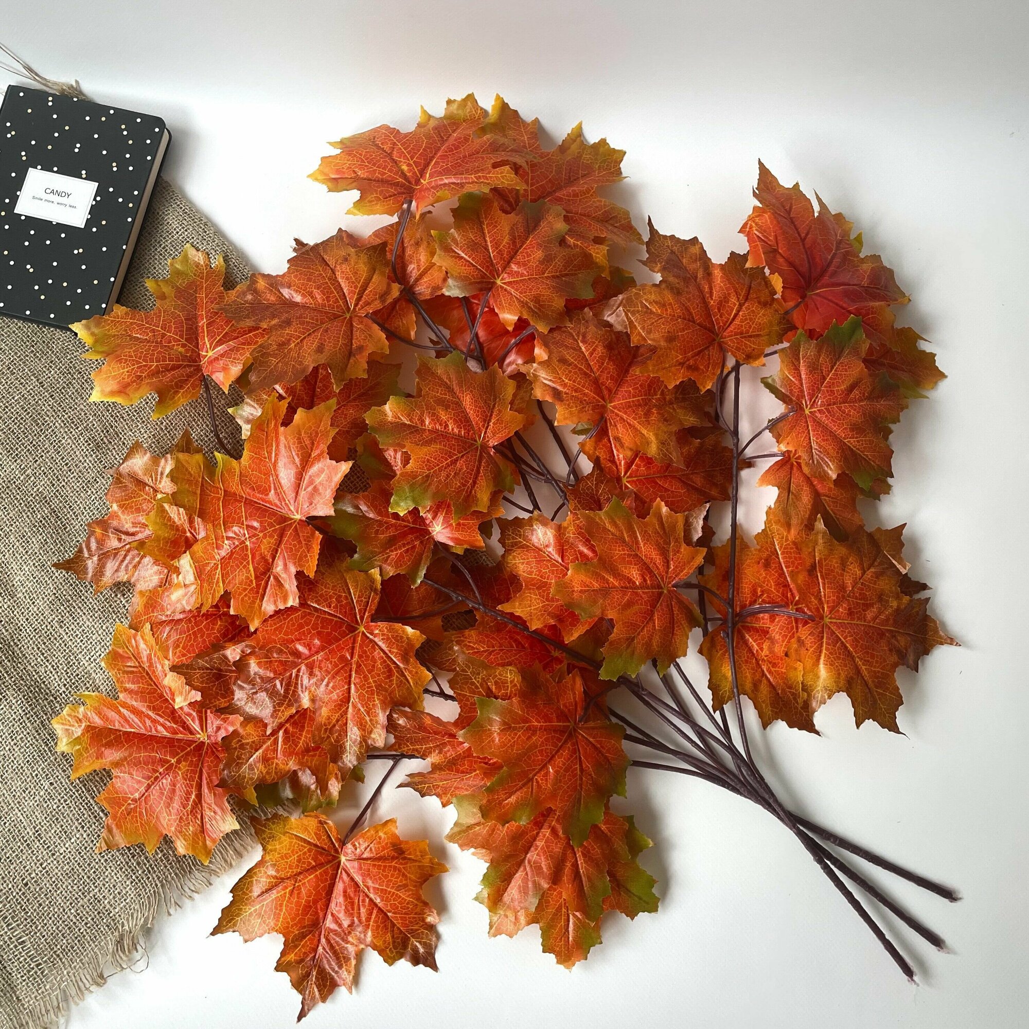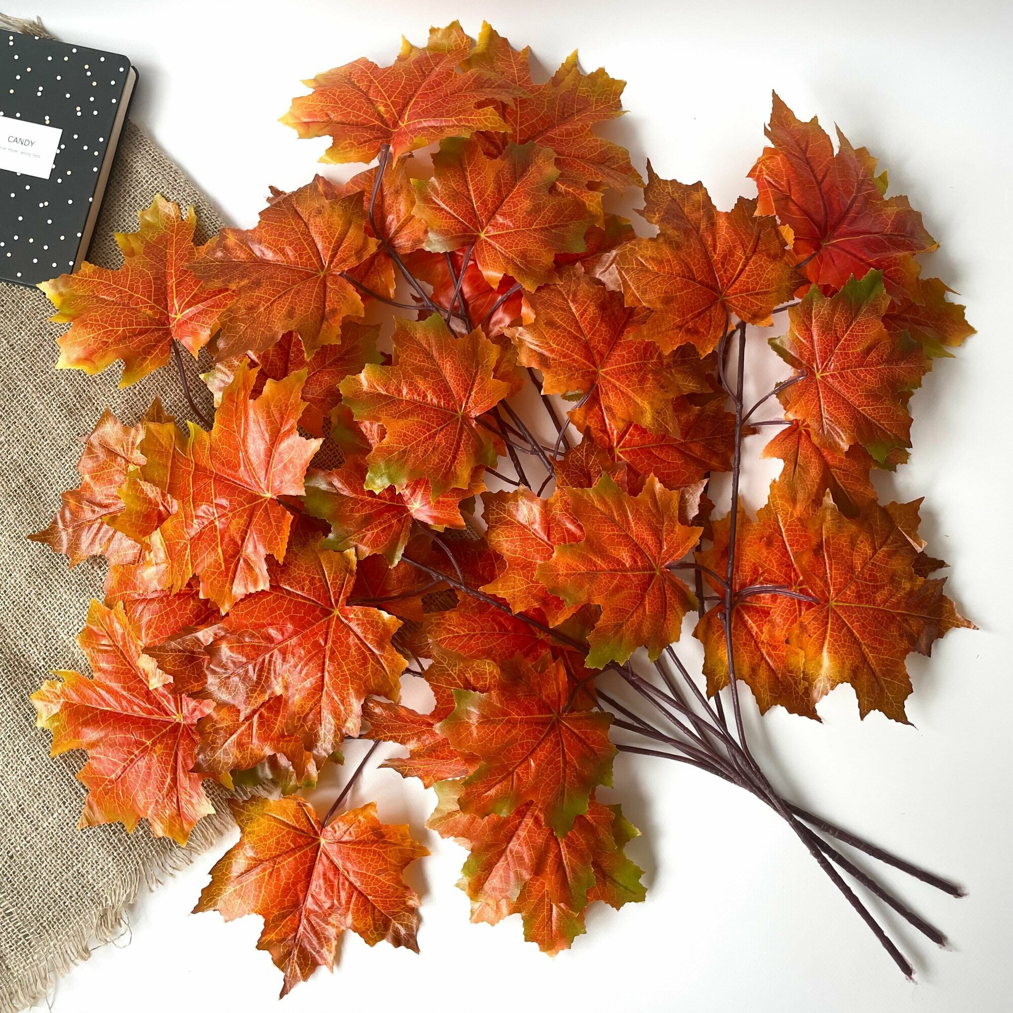 Кленовые листья искусственные на ветке, на проволоке, 34 см, осенние листья 3,5 - 7 см, 10 веток