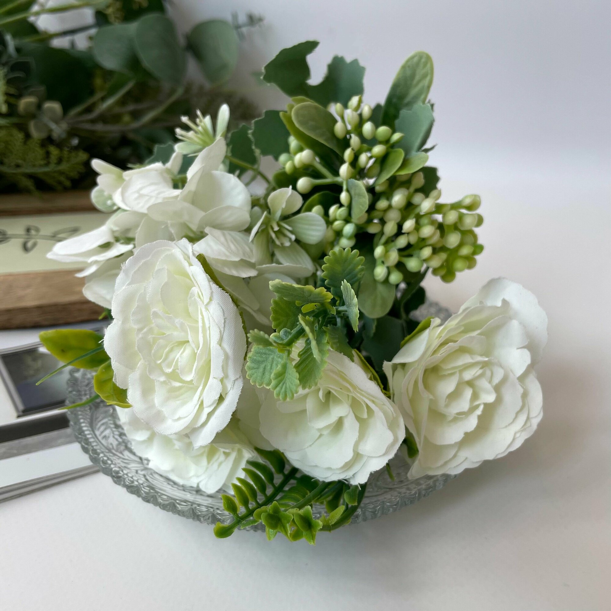 Купить Розы искусственные с гортензией, Букет цветов, Белые 27 см, 1 букет