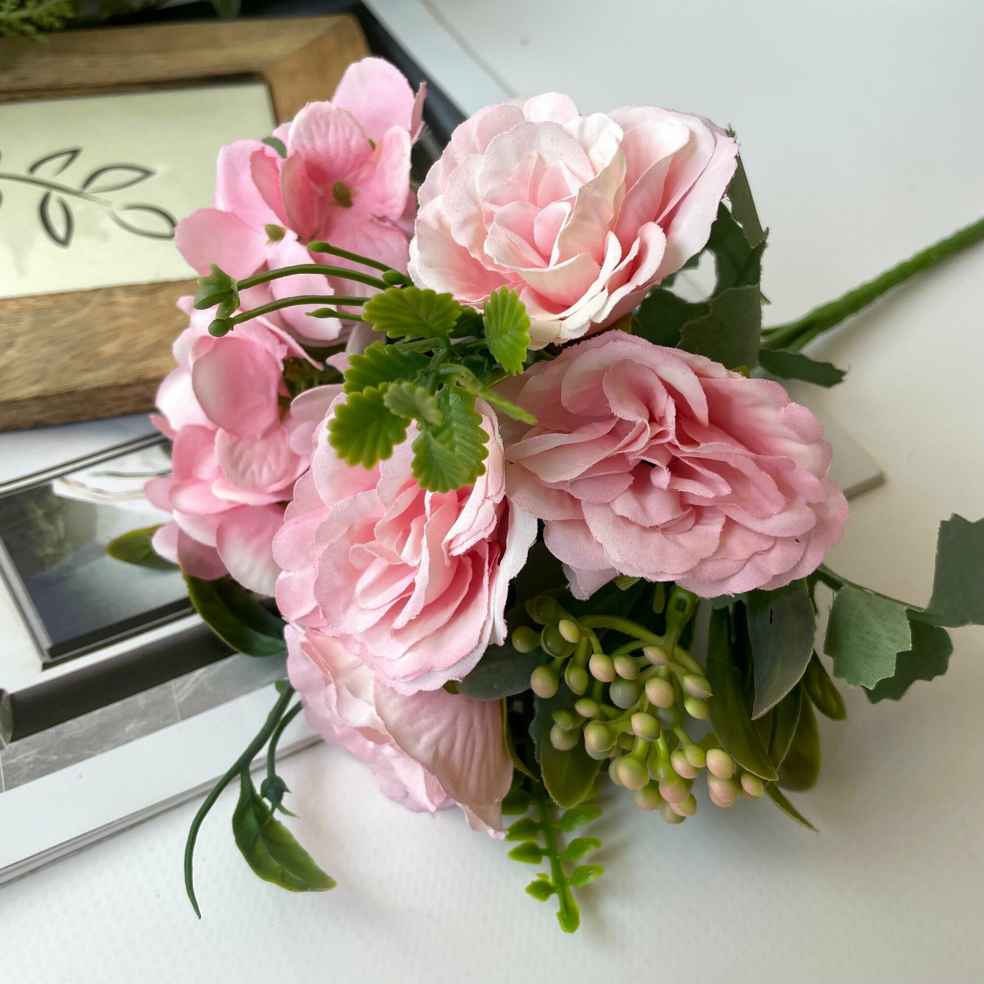 Купить Розы искусственные с гортензией и травяной добавкой, Букет цветов, Розовые 27 см, 1 букет