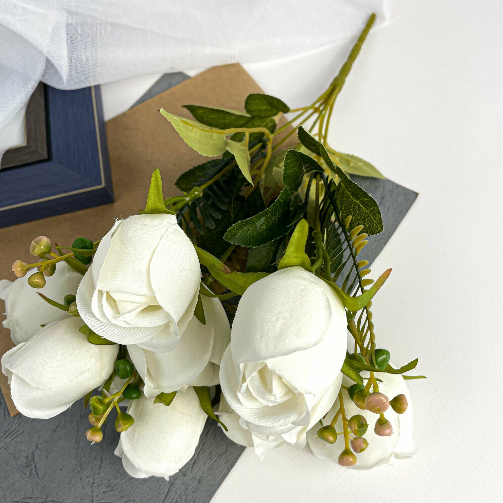 Розы пластиковые Белые, мини-бутоны, 5 веток, букет 32 см, 2 шт.