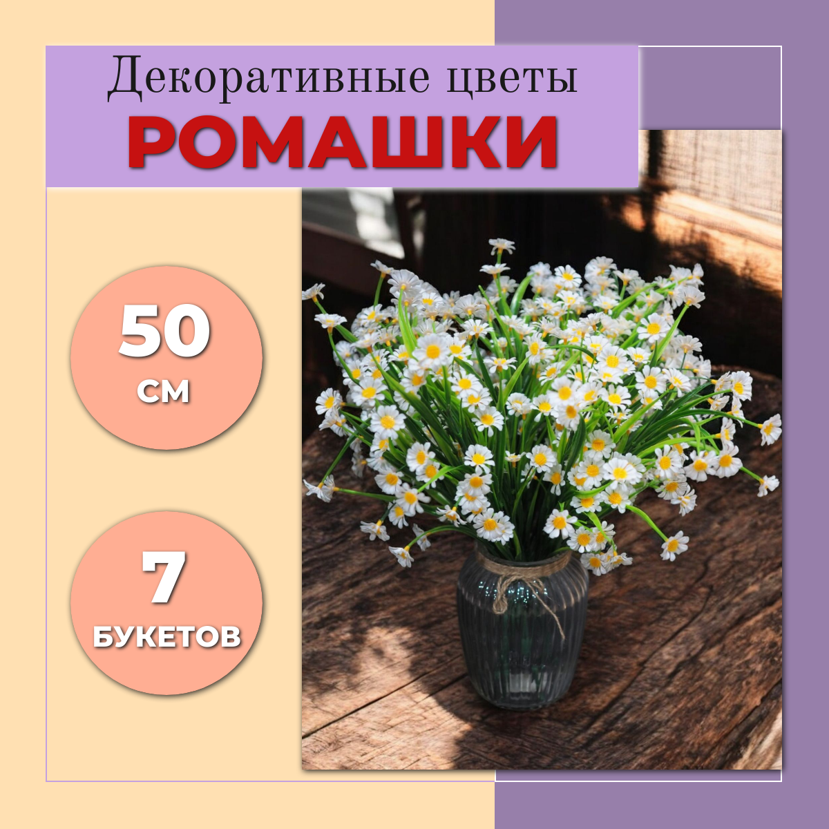 Купить Цветы Ромашки (CV3) декоративные, искусственные, интерьерные 7 букетов, 50см, белый