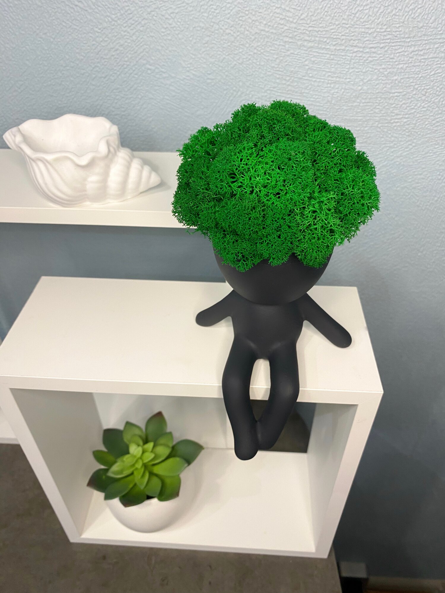 Кашпо Человечек сидящий с стабилизированным мхом черное, 17 см интересное: