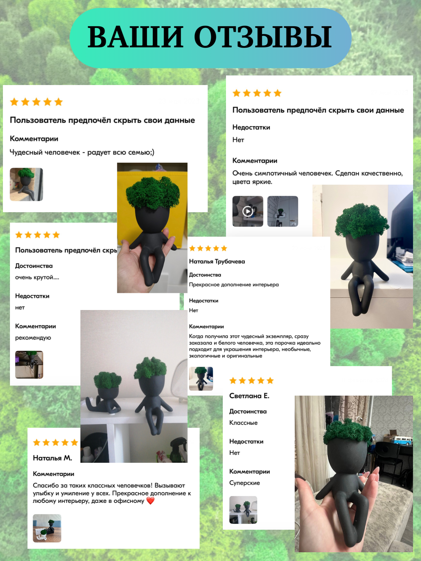 Ниже Вы можете прочитать отзывы на Кашпо Человечек сидящий с стабилизированным мхом черное, 17 см, ознакомится с подробными характеристиками, посмотреть интересные обзоры и фотографии на Кашпо Человечек сидящий с стабилизированным мхом черное, 17 см.