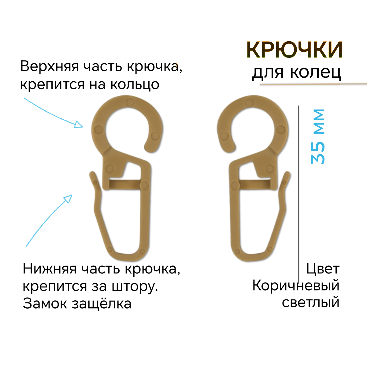 Кольца для штор с крючками .50 шт в комплекте. Коричневый светлый