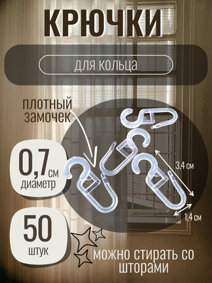 СохранитьКрючки (серьга) для кольца (диаметр 0,7см) для штор, тюли, портьер, блэкаут, карниза (прозрачные, 50 штук) интересное: