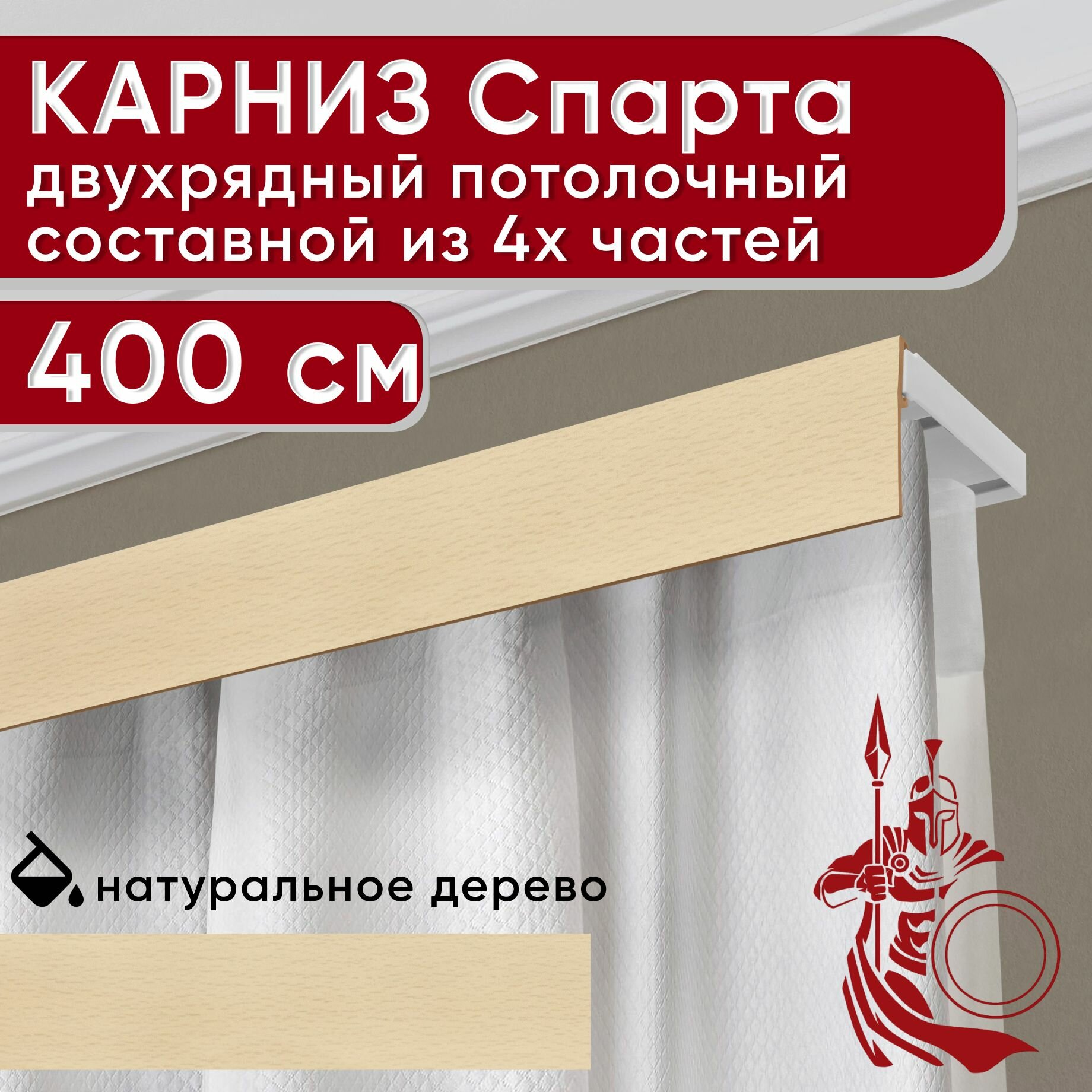Купить Карниз двухрядный потолочный пластмассовый с декоративной планкой Спарта, натуральный 400 см