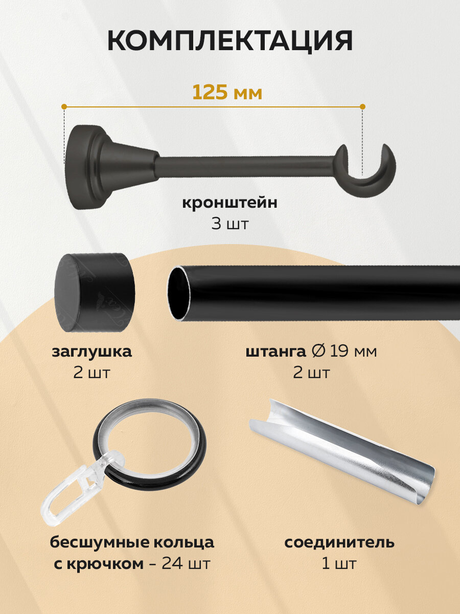 Карниз для штор настенный круглый двухрядный металлический бесшумный 160см Mirtex Premium черный 19/19 мм составной гладкий, гардина для штор