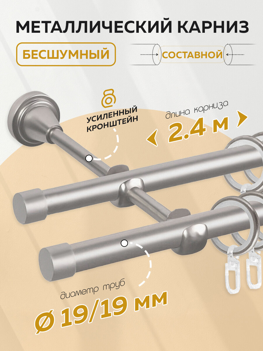 Карниз для штор Mirtex Премиум Сатин Хайп, диаметр 19мм, двухрядный, 240х19, серебристый