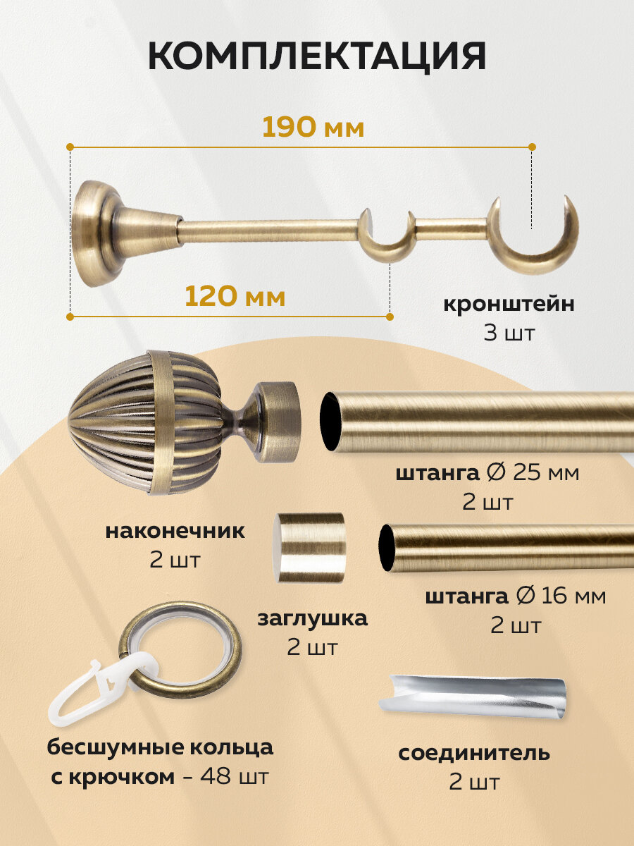 Карниз для штор настенный круглый двухрядный металлический бесшумный 240см Mirtex Premium Антик 25/16мм составной гладкий, гардина для штор