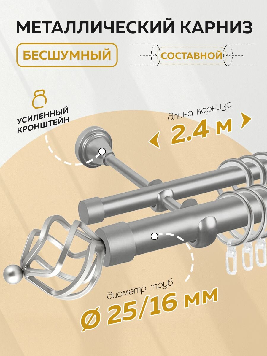 Карниз для штор настенный круглый двухрядный металлический бесшумный 240см Mirtex Premium Сатин 25/16мм составной гладкий, гардина для штор